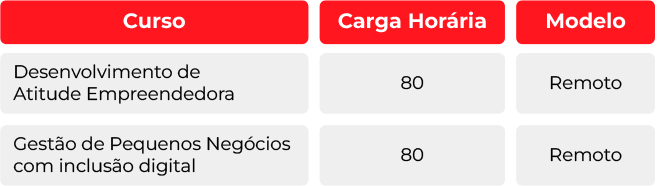 - Acesso à capacitações promovidas pela Secretária de Desenvolvimento Econômico, PAB e parceiros, como o SEBRAE;